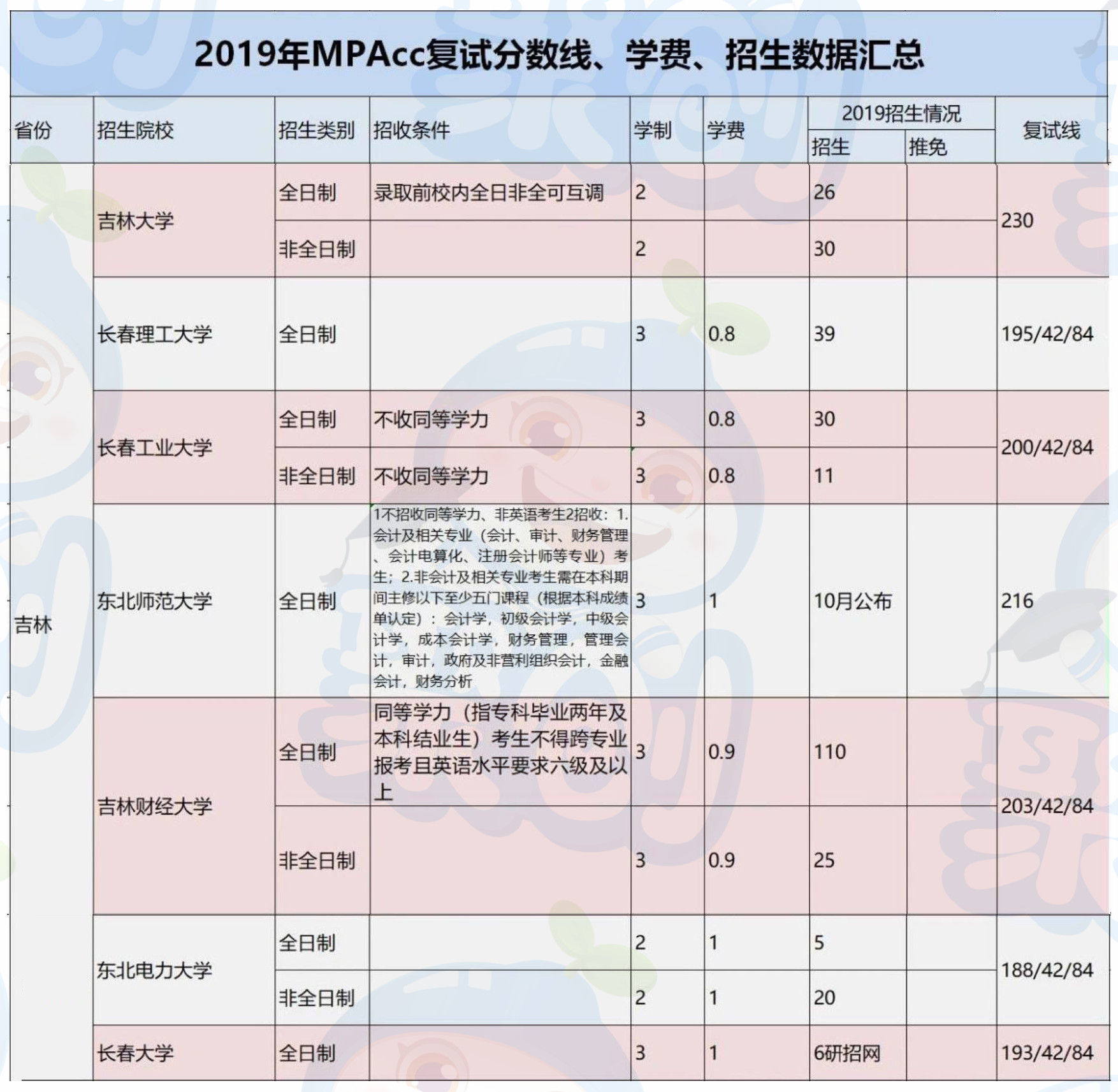 以上是聚创考研网为考生整理的"【吉林省】2019年高校会计硕士考研分数线、学费、招生情况分析"的相关考研信息,希望对大家考研备考有所帮助! 备考过程中如有疑问,也可以添加老师微信H17720740258进行咨询。