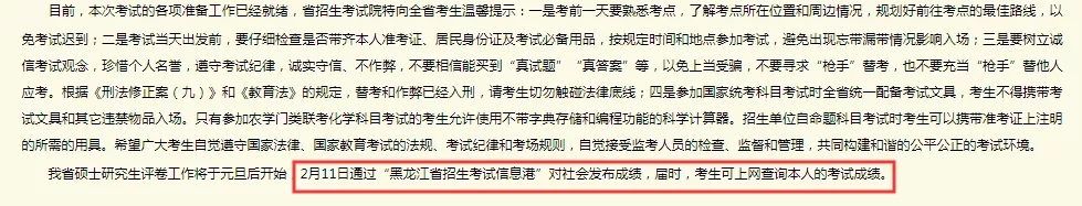 2月11日通过“黑龙江省招生考试信息港”对社会发布成绩,届时,考生可上网查询本人的考试成绩。