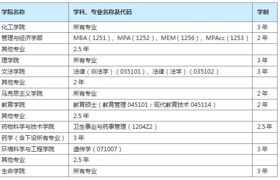 除上表所列学院及专业外,其他学院的所有专业学制均为2.5年。新生入学后双向选择指导教师。