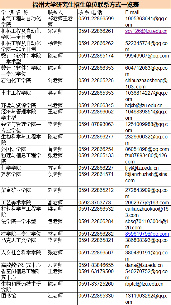 以上是聚创考研网为考生整理的"2018年福州大学各招生单位联系方式"的相关考研信息,希望对大家考研备考有所帮助!