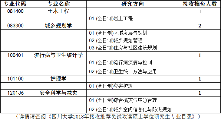 3.凡有意报考我院2018年推免硕士研究生的应届本科毕业生皆需填报《四川大学灾后重建与管理院2018年接收推免硕士研究生填报表(电子版)》(见附件),申请人填好该表后请发送到252448749@qq.com,填报表接收截止日期2017年9月27日中午12:00。
