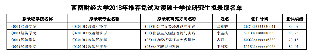 以上是聚创考研网为考生整理的"西南财经大学2018级推免生录取名单公示"的相关考研信息,希望对大家考研备考有所帮助! 备考过程中如有疑问,也可以添加老师微信H17720740258进行咨询。
