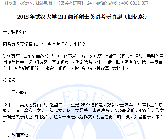 聚英武大考研网整理了2018年武汉大学211翻译硕士英语考研真题(回忆版),部分内容如下: