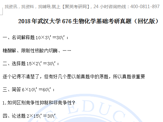 聚英武大考研网整理了2018年武汉大学676生物化学基础考研真题(回忆版),部分内容如下: