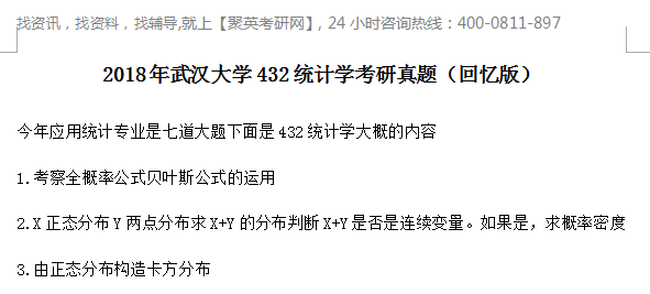 聚英武大考研网整理了2018年武汉大学432统计学考研真题(回忆版),部分内容如下: