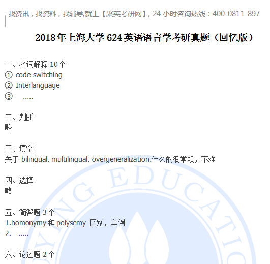 以上是聚创考研网为考生整理的"2018年上海大学624英语语言学考研真题(回忆版)"的相关考研信息,希望对大家考研备考有所帮助! 备考过程中如有疑问,也可以添加老师微信H17720740258进行咨询。
