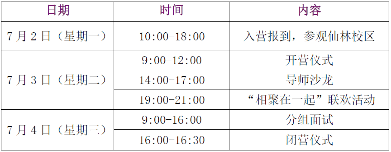 参加夏令营的同学须携带纸质版的申请材料,于7月2日10:00-18:00前往鼓楼校区有园宾馆(南园教育超市旁)报到。