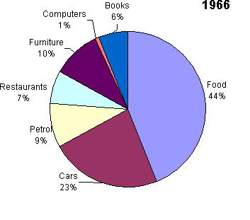 The charts below show US spending patterns from 1966 to 1996. Please give a title of your own and summarise the information by selecting and reporting the main features, and make comparisons where relevant. You should write at least 150 words.