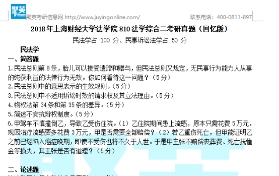 以上是聚创考研网为考生整理的"2018年上海财经大学810法学综合二考研真题(回忆版)"的相关考研信息,希望对大家考研备考有所帮助! 备考过程中如有疑问,也可以添加老师微信H17720740258进行咨询。