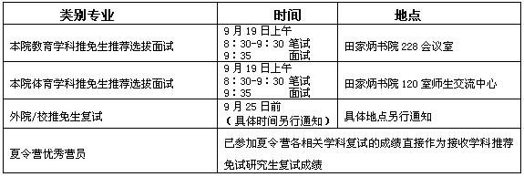 3、外院/校推免生复试工作根据生源报考情况,由研究生科在教育学、体育学各二级学科范围内依据报考专业组织若干复试组进行学科录取选拔复试。复试形式采用面试(含笔试)。