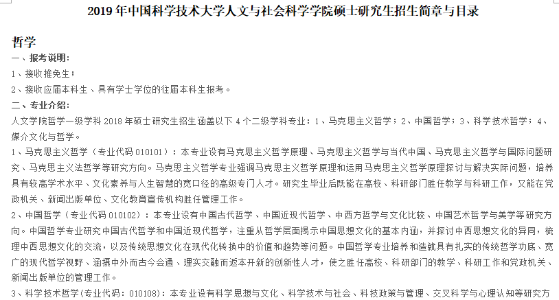 据悉2019年中国科学技术大学人文与社会科学学院硕士研究生招生简章与目录已公布,聚英中国科学技术大学考研网小编为你整理内容如下: