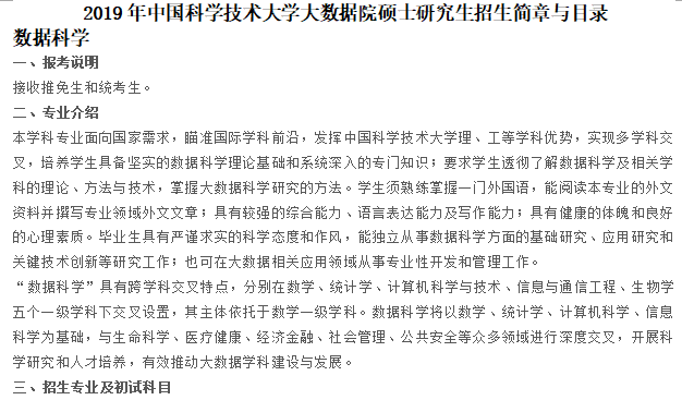 以上是聚创考研网为考生整理的"2019年中国科学技术大学大数据学院硕士研究生招生简章与目录"的相关考研信息,希望对大家考研备考有所帮助! 备考过程中如有疑问,也可以添加老师微信H17720740258进行咨询。