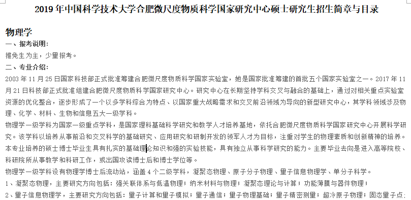 据悉2019年中国科学技术大学合肥微尺度物质科学国家研究中心硕士研究生招生简章与目录已公布,聚英中国科学技术大学考研网小编为你整理内容如下: