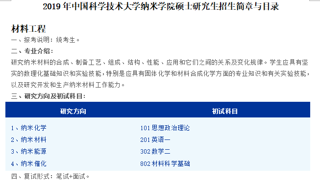 以上是聚创考研网为考生整理的"2019年中国科学技术大学纳米学院硕士研究生招生简章与目录"的相关考研信息,希望对大家考研备考有所帮助! 备考过程中如有疑问,也可以添加老师微信H17720740258进行咨询。