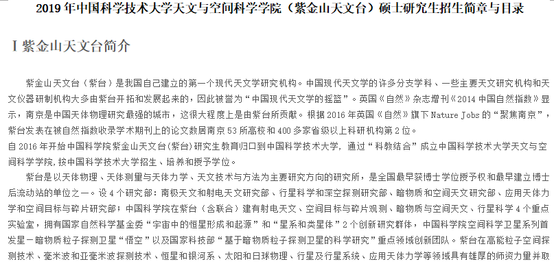据悉2019年中国科学技术大学天文与空间科学学院(紫金山天文台)硕士研究生招生简章与目录已公布,聚英中国科学技术大学考研网小编为你整理内容如下: