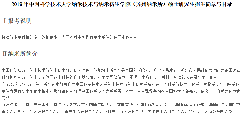 以上是聚创考研网为考生整理的"2019年中国科学技术大学纳米技术与纳米仿生学院硕士研究生招生简章与目录"的相关考研信息,希望对大家考研备考有所帮助! 备考过程中如有疑问,也可以添加老师微信H17720740258进行咨询。