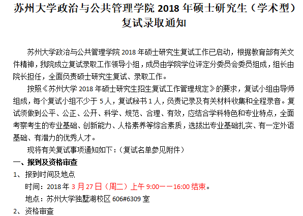 据悉,苏州大学政治与公共管理学院2018年硕士研究生(学术型)复试录取通知已公布, 聚英苏州大学考研网小编为大家整理内容如下: