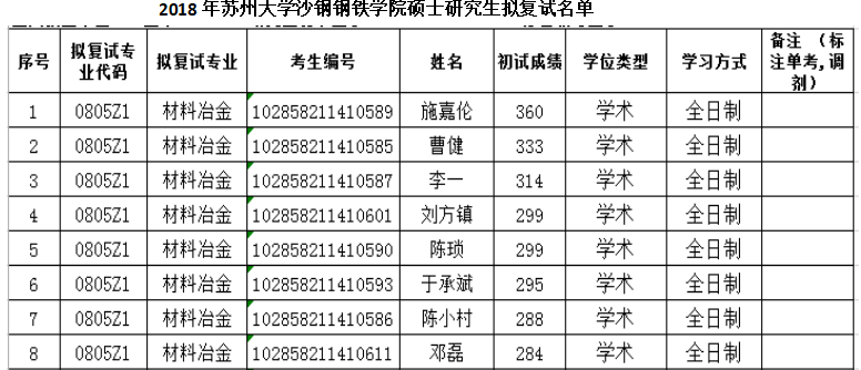 据悉,2018年苏州大学沙钢钢铁学院硕士研究生拟复试名单已经公布,聚英苏州大学考研网为您整理如下: