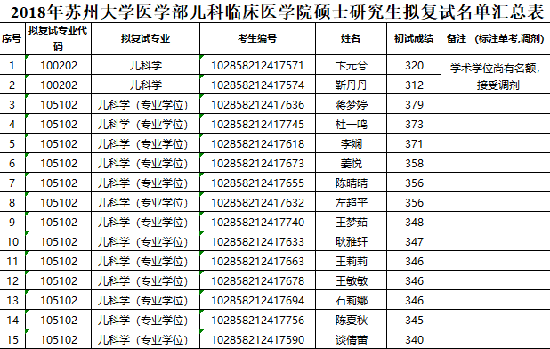 据悉,2018年苏州大学医学部儿科临床医学院硕士研究生拟复试名单汇总表已经公布,聚英苏州大学考研网为您整理如下: