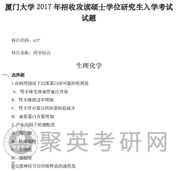 聚英厦大考研网整理了2017年厦门大学637药学综合考研真题(回忆版),部分内容如下: