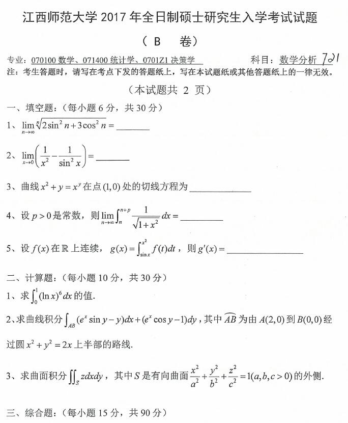 热门关键词:江西师范大学数学 721数学分析考试真题 数学与信息科学学院考试真题