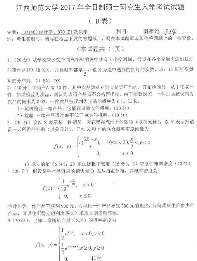 据悉,2017年江西师范大学734概率论硕士研究生考试真题已公布,聚英江西师范大学考研网小编为你整理如下内容:
