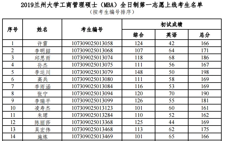 据悉,2019年兰州大学工商管理硕士(MBA)第一志愿上线考生名单已公布,聚英兰州大学考研网小编为你整理如下内容: