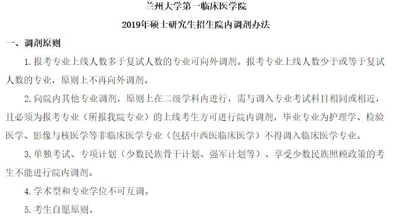 据悉,兰州大学2019年第一临床医学院研究生招生院内调剂办法已公布,聚英兰州大学考研网小编为大家整理如下:
