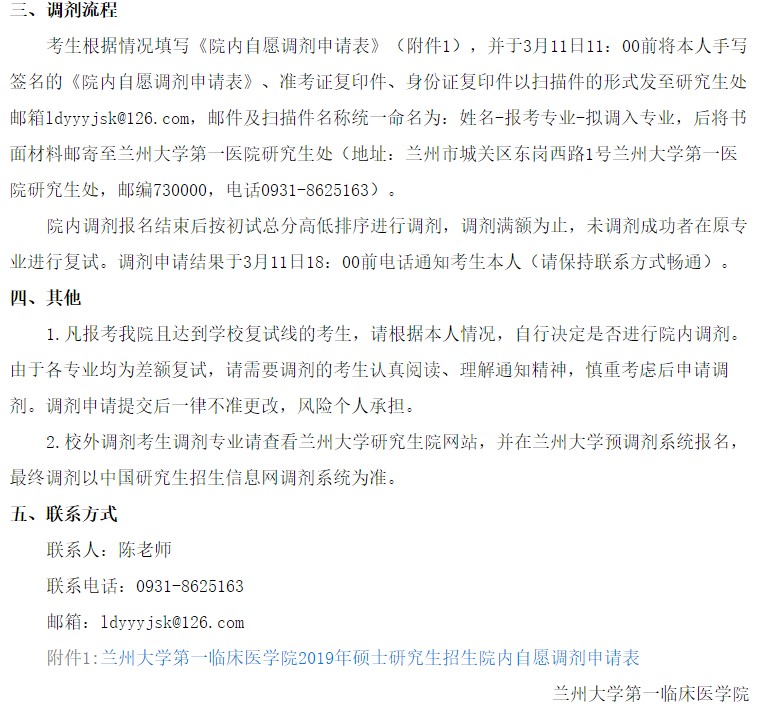 以上是聚创考研网为考生整理的"兰州大学2019年第一临床医学院硕士研究生调剂办法"的相关考研信息,希望对大家考研备考有所帮助! 备考过程中如有疑问,也可以添加老师微信H17720740258进行咨询。