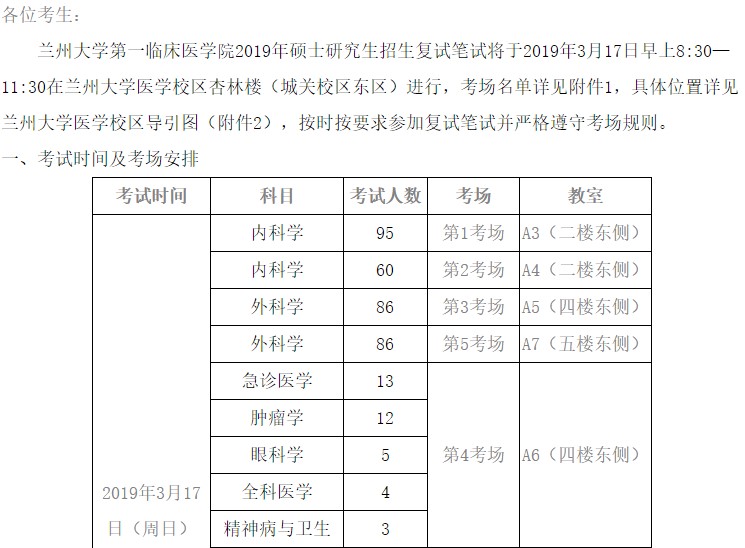据悉,兰州大学第一临床医学院2019年硕士研究生招生复试笔试安排已公布,聚创兰州大学考研网小编为你整理如下内容: