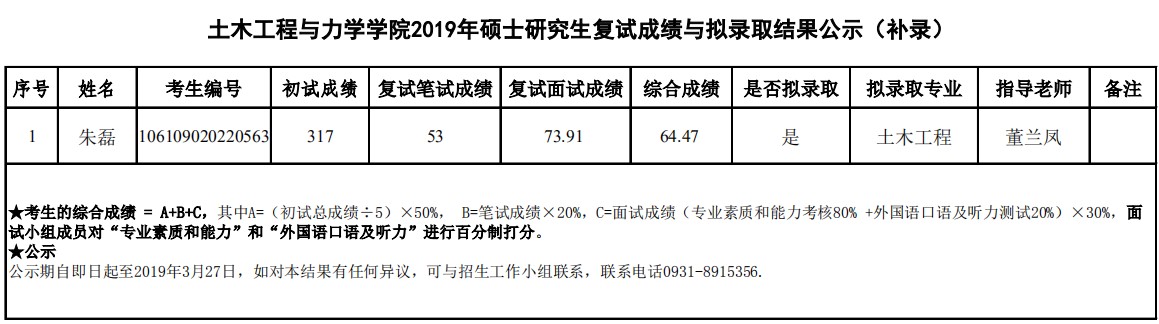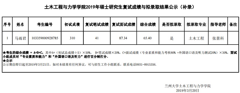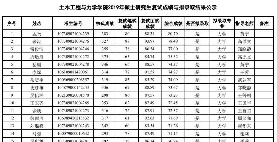 据悉,土木工程与力学学院2019年硕士研究生复试成绩与拟录取结果公示已公布,聚创兰州大学考研网小编为你整理如下内容: