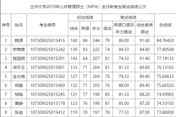 附件:兰州大学2019年公共管理硕士(MPA)全日制考生复试成绩公示