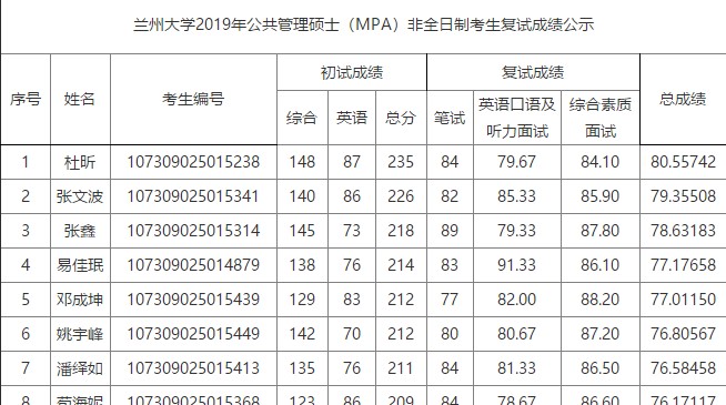 附件:兰州大学2019年公共管理硕士(MPA)非全日制考生复试成绩公示