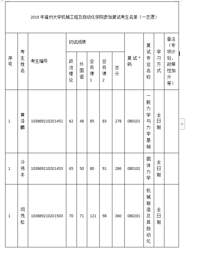 完整版名单请查看附件:2019年福州大学机械工程及自动化学院参加复试考生名单(一志愿).docx