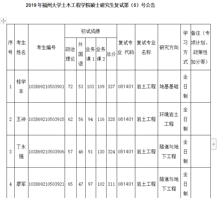 完整版名单请查看附件:2019年福州大学土木工程学院硕士研究生复试第(5)号公告.docx