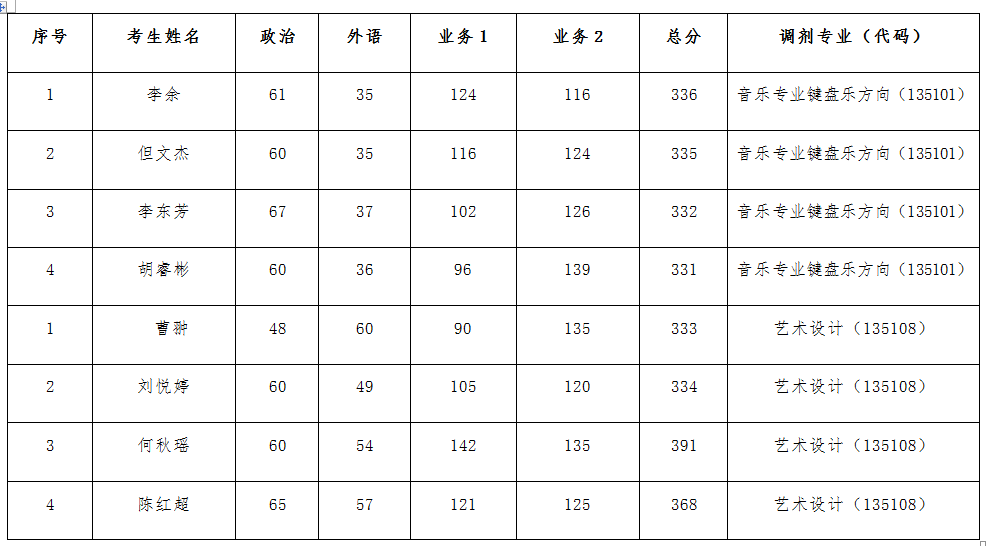 根据2019年艺术学院研究生专业学位招生计划指标,目前音乐专业声乐方向(代码135101-01)已经完成招生计划;音乐专业键盘乐方向(代码135101-02)剩余3个名额,艺术设计专业(代码135108)剩余1个名额,学院近期将组织第二轮复试录取工作。根据《教育部关于印发<2019年全国硕士研究生招生工作管理规定>的通知》(教学〔2018〕5号)、《教育部办公厅关于进一步规范和加强研究生考试招生工作的通知》(教学厅〔2019〕2号)、《兰州大学2019年硕士研究生招生复试录取办法》、《兰州大学2019年硕士研究生优秀生源调剂办法》以及《2019年艺术学院硕士研究生招生复试录取实施细则》等相关文件要求,按照复试不低于120%的比例进行遴选,现将参加第二轮研究生招生复试考生名单及成绩公布: