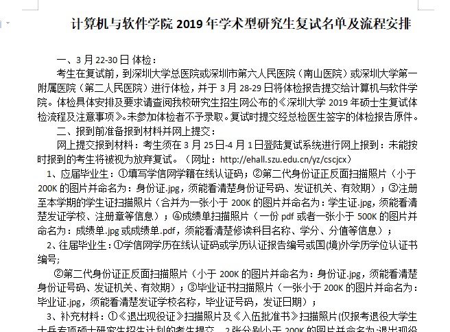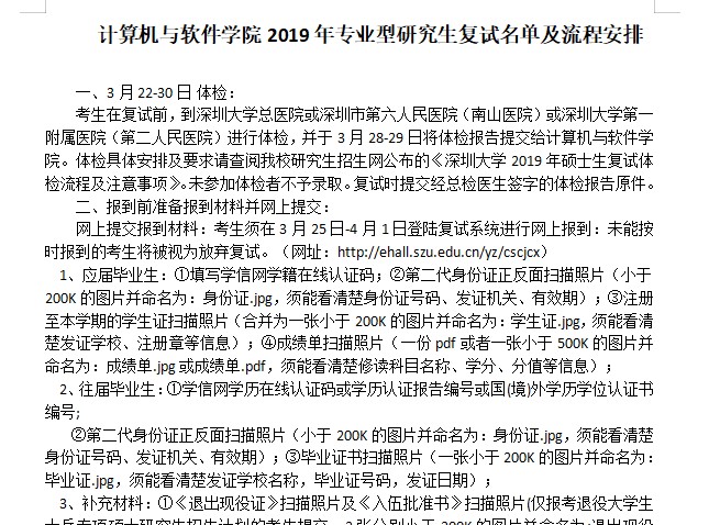 据悉,深圳大学计算机与软件学院2019年硕士研究生复试名单及流程安排已公布,聚创深圳大学考研网小编为你整理如下内容: