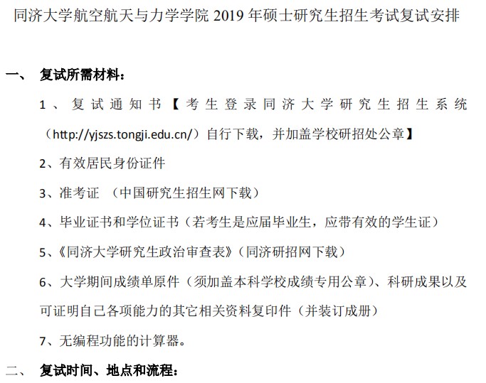 附件:同济大学航空航天与力学学院2019年硕士研究生招生考试复试安排