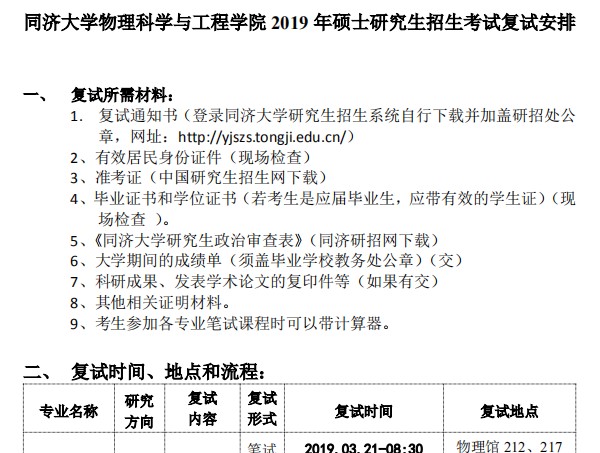 据悉,同济大学物理科学与工程学院2019年硕士研究生招生考试复试安排已公布,聚创同济大学考研网小编为大家整理了相关信息,具体内容如下: