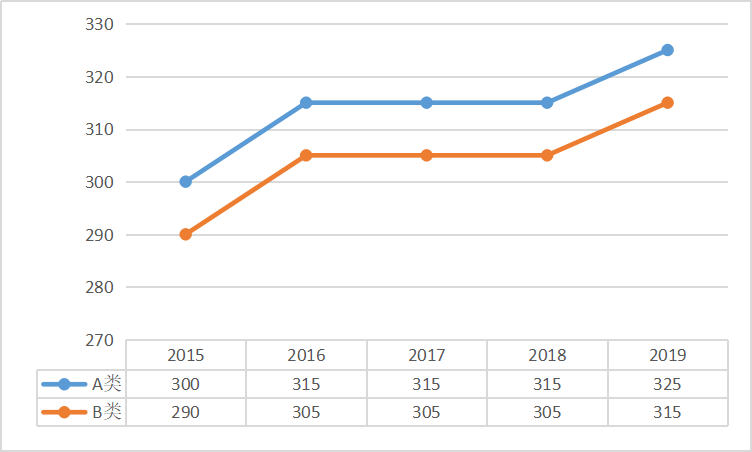 2015-2019年历史学总分国家线趋势图及单科复试分数