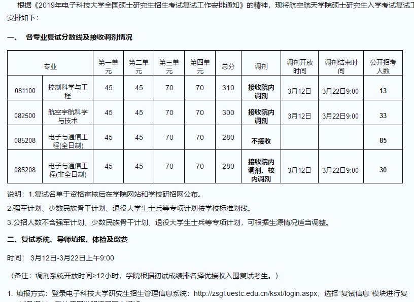 据悉,2019年电子科技大学航空航天学院硕士研究生招生考试复试工作办法已公布,聚创电子科技大学考研网为你整理如下内容: