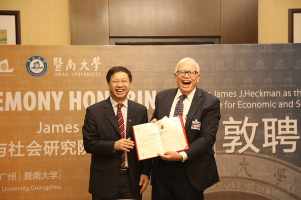 Heckman教授(右)与暨南大学校长宋献中(左)