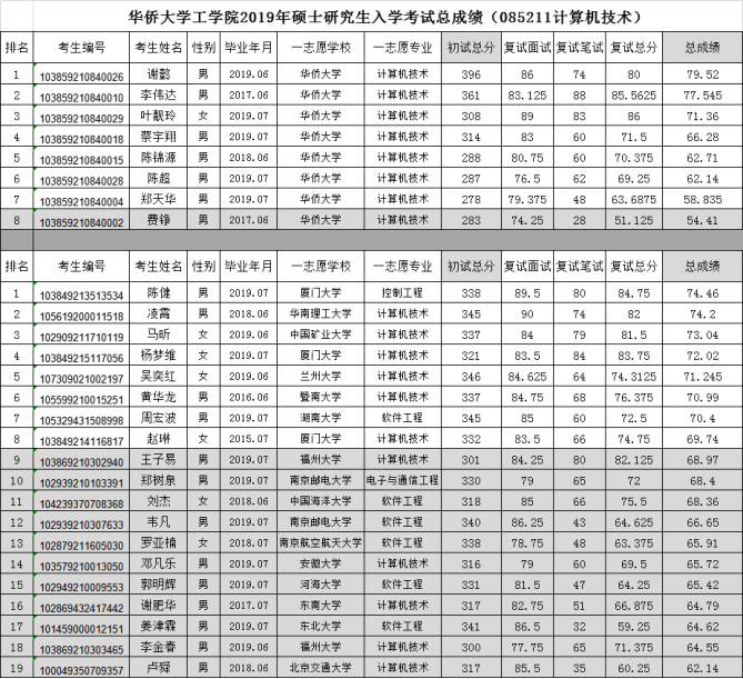 据悉,华侨大学工学院2019硕士研究生复试结果公示已公布,聚创华侨大学考研网小编为你整理如下内容:
