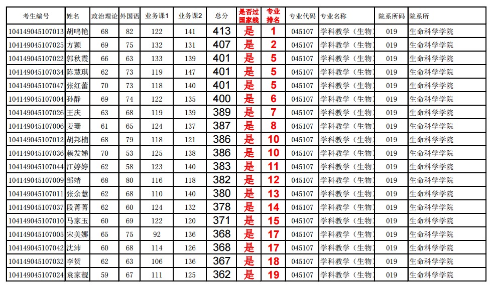附件:江西师大生命科学学院2019年硕士研究生一志愿复试名单
