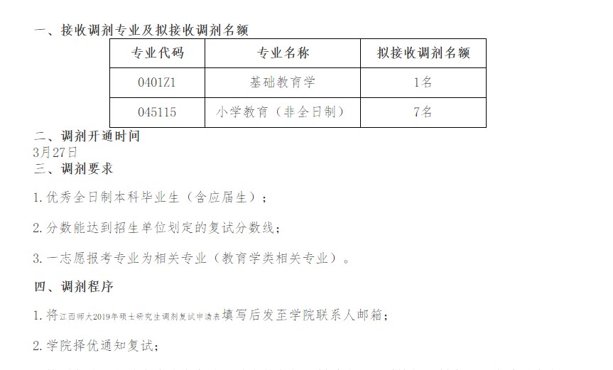 据悉,江西师范大学初等教育学院2019年硕士研究生调剂公告已公布,聚创江西师大考研网为您整理如下: