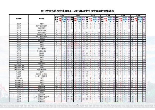 完整版请下载附件:厦门大学各院系专业2014—2019年硕士生报考录取数据统计表