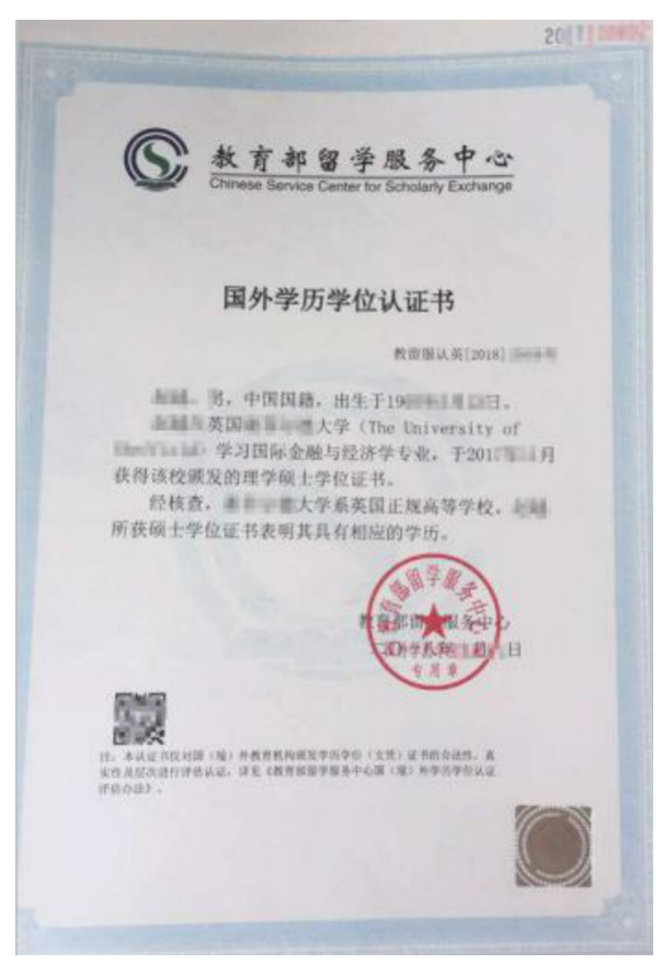 2、在境外获得学历证书的考生,除上传“通用材料”、“考点特殊材料”外,还须上传教育部留学服务中心出具的《国外学历学位认证书》。样稿如下: