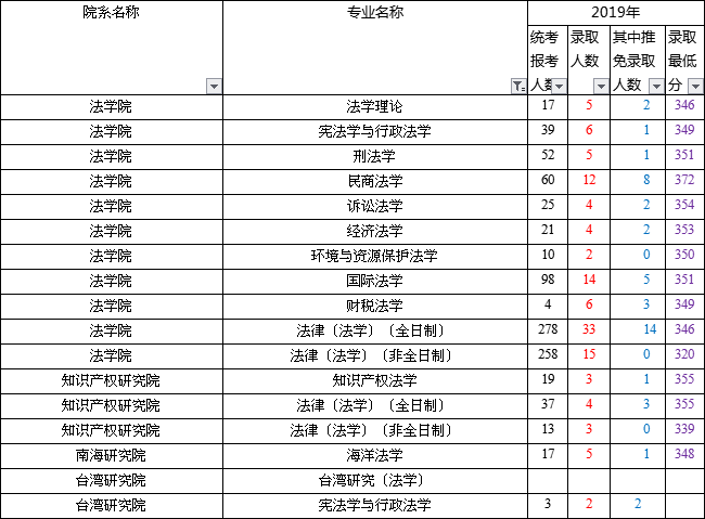 厦大2019年法学类的报考人数也是非常多的,期中法律法学报考人数就达到了278人。