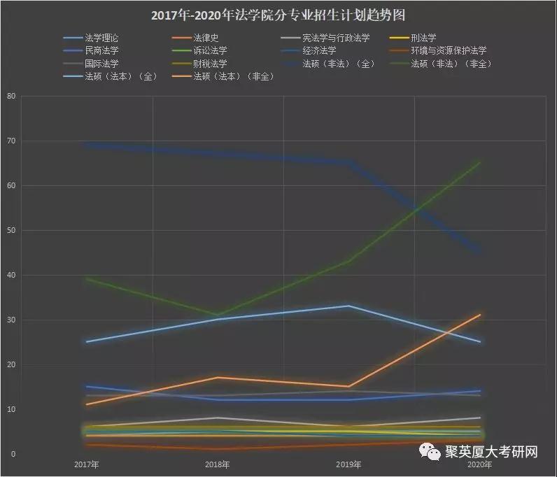 再根据上表制作2017年-2020年厦大法学院分专业招生计划趋势图如下: