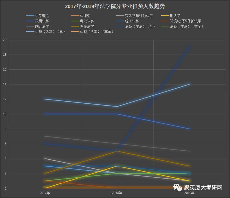 以及2017年-2019年法学院分专业推免人数趋势图如下: